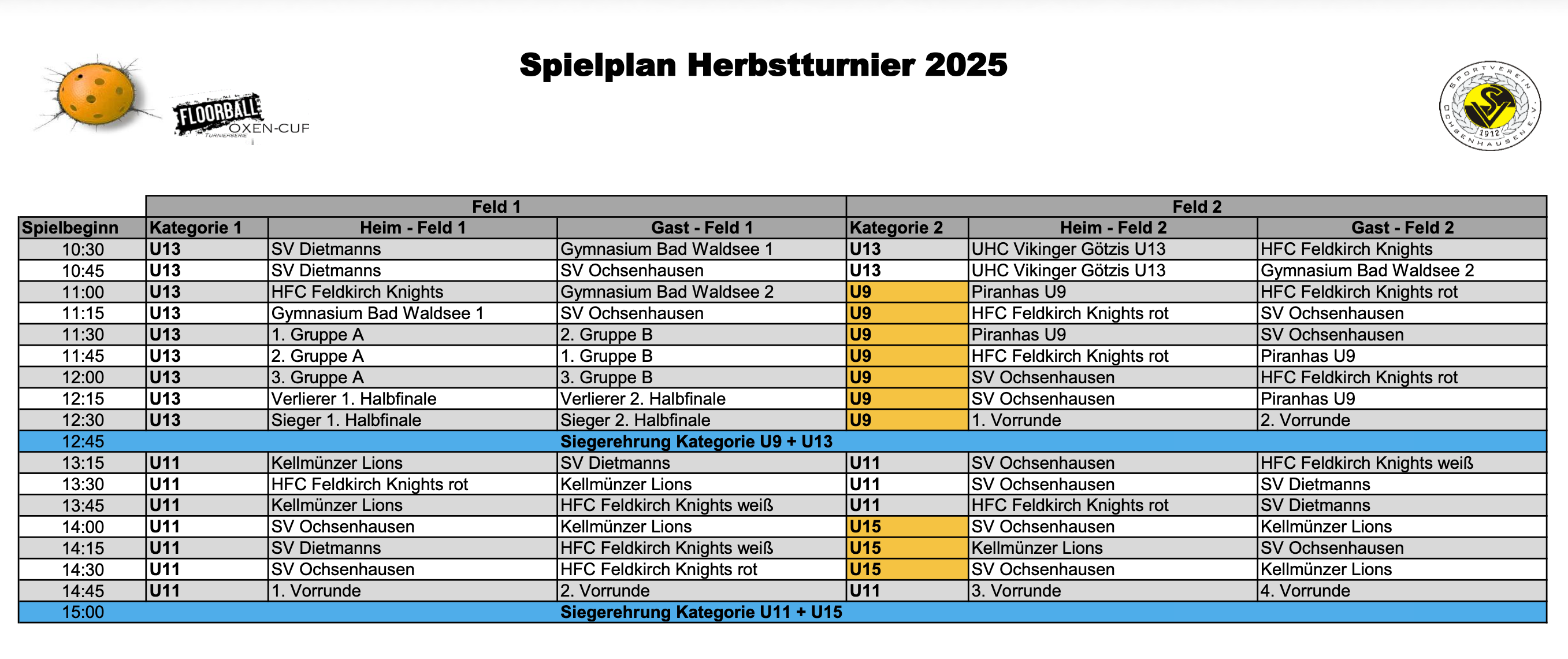 Im Vorjahr konnten folgende Teams triumphieren: Jugend U9: Piranhas - I., Jugend U11: HFC Feldkirch Knights weiß, Jugend U13: HFC Feldkirch Knights, Jugend U15: SV Ochsenhausen U15. Auch in der Saison 2025/26 geht es neben dem Turniersieg um die begehrten Punkte für die Oxen-Cup-Gesamtwertung.